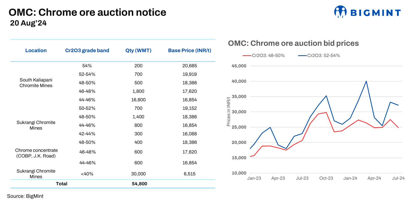 OMC is set to auction 54,800 t of chrome ore from the South Kaliapani and Sukrangi mines on 20 Aug’24. The offered quantity has been reduced by approximately 10,900 t, with base prices seeing a marginal 5% decline (INR 352-1,002/t) across grades compared to last month. Despite the downturn in the ferro chrome prices, OMC has lowered the base price marginally. Additionally, around 3,800 t of lumps and fines (32-42% grades) will be offered from the Bangur mines.
