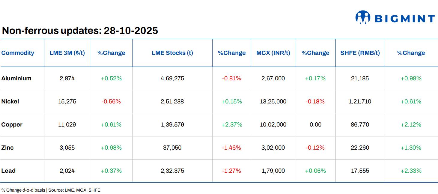 Copper prices held just below record highs as easing US-China trade tensions lifted market sentiment and improved demand prospects. The optimism was tempered by ongoing supply disruptions at major mines, including Grasberg and Kamoa-Kakula, which kept the market tight. Copper has rallied about 25% this year, and analysts expect further gains if trade relations continue to improve. On the LME, copper traded near $11,009/t, with aluminium steady and zinc slightly lower.