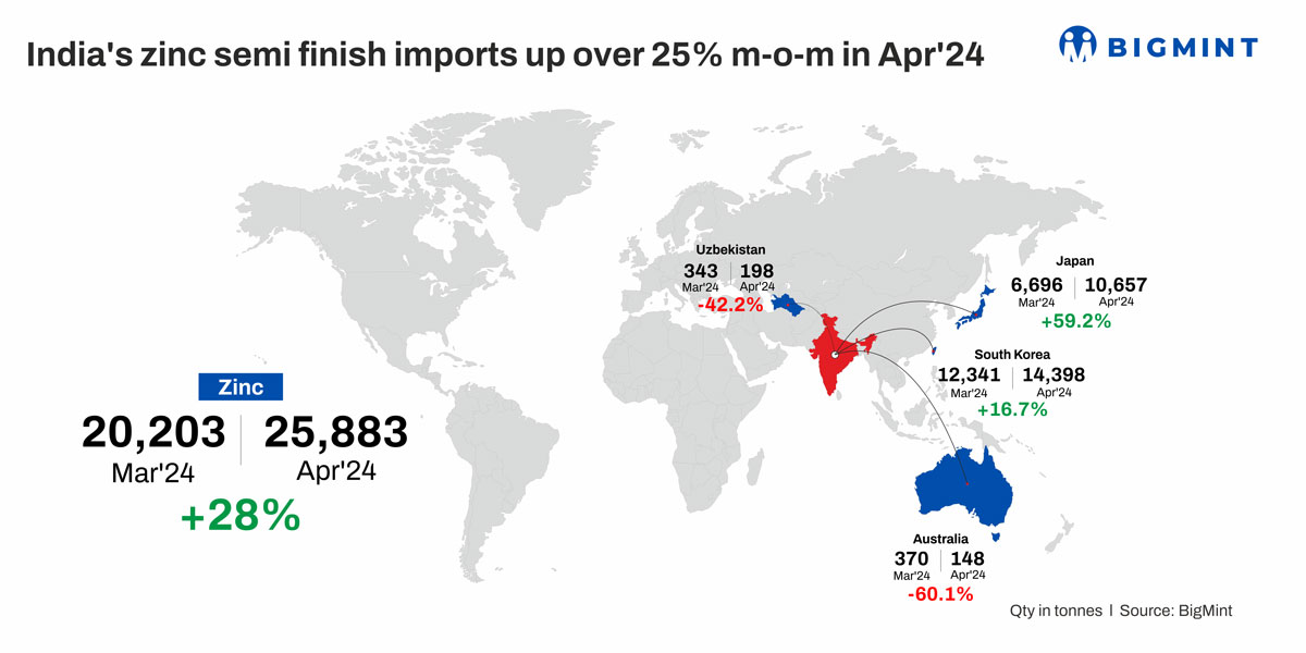 India’s imports of zinc semi-finished products stood at 25,883 t in Apr’24, up by 28% m-o-m compared to 20,203 t in Mar’24. Currently, there was a 34% surge in imports on a y-o-y basis from 19,285 t in Apr’23. India’s primary source of semi-finished majorly came from South Korea with 14,398 t, 17% up than last month, followed by 10,657 t from Japan, a 59% rise from last month.