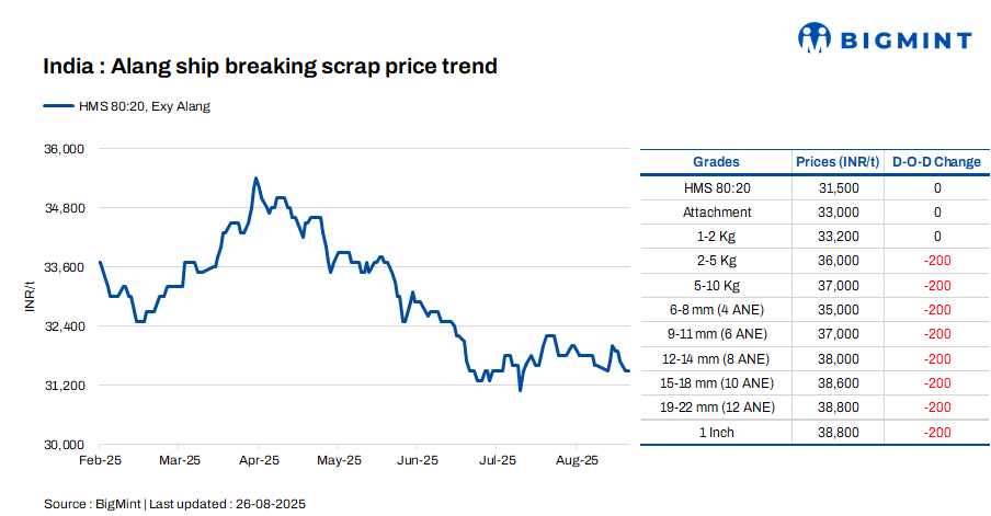 Ship-breaking melting scrap prices in Alang, Gujarat, remained stable d-o-d on 26 Aug’25. According to BigMint’s assessment, HMS (80:20) prices were at INR 31,500/t ($359/t) ex-yard. Trade activity in both semi-finished and finished steel was sluggish during yesterday’s trading session compared with the past few days. This, along with moderate trade activities for scrap, prompted suppliers to keep their offers stable today.