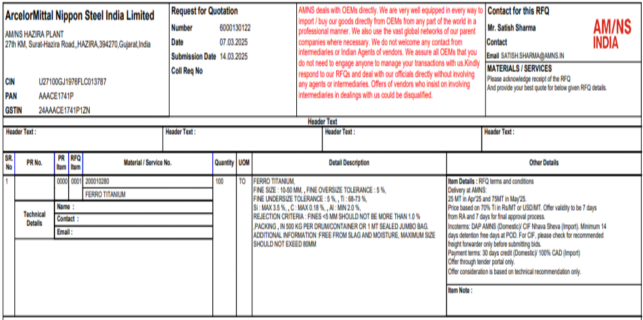 ArcelorMittal Nippon Steel (AM/NS) India has issued a purchase tender for 100 t of ferro titanium (Ti: 68-73%) for its Gujarat-based plant. The last date for bid submission is 14 Mar’25, and delivery is scheduled for Apr-May’25.