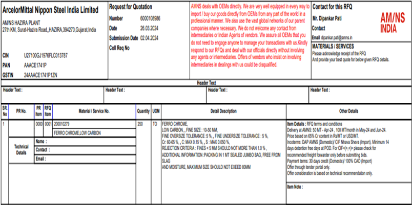 ArcelorMittal Nippon Steel (AM/NS) India has issued a purchase tender for 250 t of low-carbon ferro chrome (Cr: 60-65%, C: 0.15% max, 10-50 mm) for its Gujarat-based plant. The last date for bids submission is 2 Apr’24 and the delivery is scheduled in between Apr’24-Jun’24.