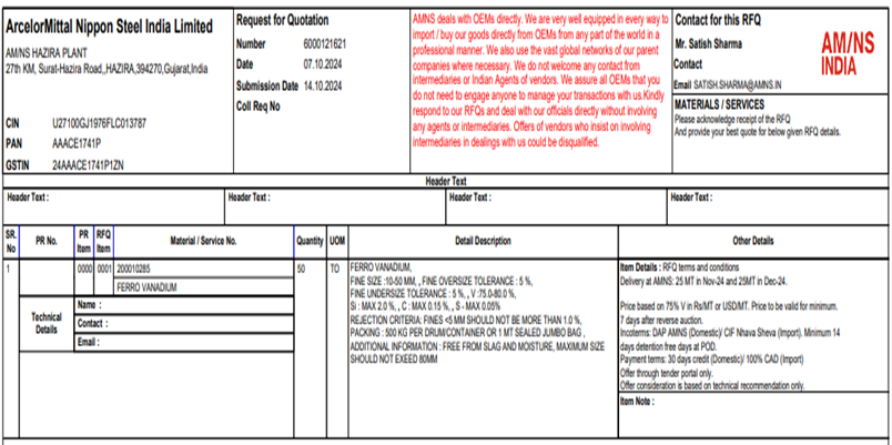 ArcelorMittal Nippon Steel (AM/NS) India has issued a purchase tender for 40 t of ferro vanadium (V: 75-80%, 10-50 mm) for its Gujarat-based plant. The last date for bid submission is 14 Oct’24, and delivery is scheduled for Nov-Dec’24.
