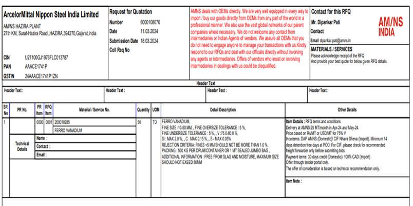 ArcelorMittal Nippon Steel (AM/NS) India has issued a purchase tender for 50 t of ferro vanadium (V: 75-80%, 10-50 mm) for its Gujarat-based plant. The last date for bids submission is 18 Mar’24 and the delivery is scheduled from Apr-May’24.