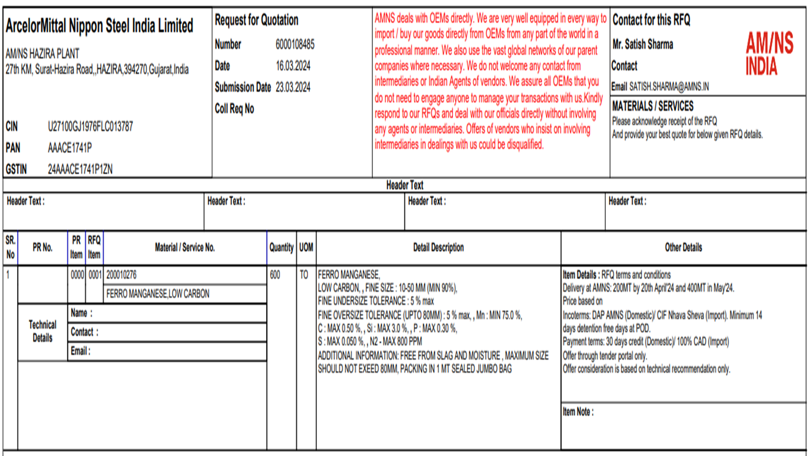 ArcelorMittal Nippon Steel (AM/NS) India has issued a purchase tender for 600 t of low-carbon ferro manganese (Mn: 75%, C: 0.50% max, 10-50 mm) for its Gujarat-based plant. The last date for submission of bids is 23 Mar’24. Delivery of material is scheduled for 200 t in Apr’24 and 400 t in May’24.The payment terms are 30 days credit/100% CAD (import).