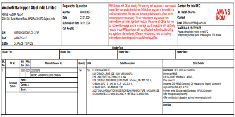 ArcelorMittal Nippon Steel (AM/NS) India has issued a purchase tender for 750 t of low-carbon ferro manganese (Mn: 75%, C: 0.50% max, 10-50 mm) for its Gujarat-based plant. The last date for submission of bids is 30 Jan’24. Delivery of material is scheduled for Feb-Mar’24 and the payment terms are 30 days credit/100% CAD (import).