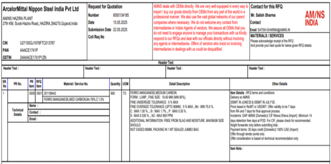 ArcelorMittal Nippon Steel (AM/NS) India has issued a purchase tender for 800 t of medium-carbon ferro manganese (Mn: 78%, C: 1.5%, 10-50 mm) for its Gujarat-based plant. The last date for submission of bids is 15 Apr’25. Delivery of material is scheduled for Jun-Jul and the payment terms are 30 days credit/100% CAD (import).