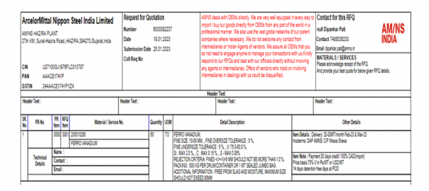 ArcelorMittal Nippon Steel India (AM/NS India) has floated a request for quotation for 60 t of ferro vanadium (10-50 mm, V: 75-80%) from its Gujarat-based plant. The last date of bid submission is 25 Jan’23. The delivery is scheduled for Feb-Mar’23 and the payment terms are 30 days credit/100% CAD (import).