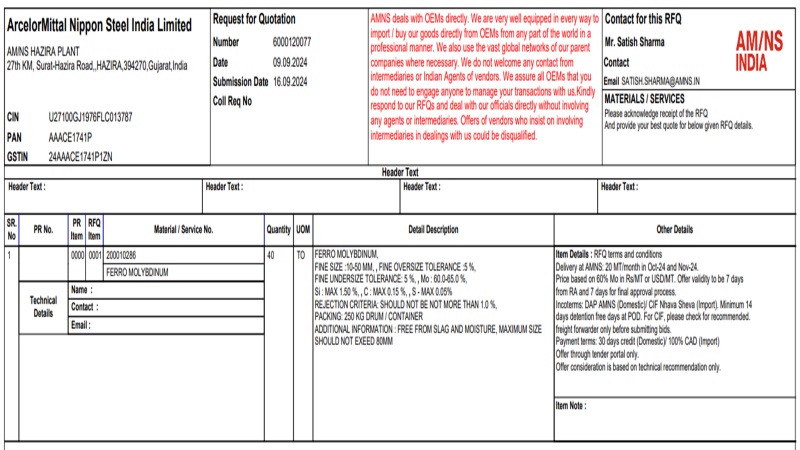 ArcelorMittal Nippon Steel (AM/NS) India has floated a purchase tender for 40 t of ferro molybdenum (Mo: 60-65%, size: 10-50mm) for its Gujarat-based plant. The last date for submission of bids is 16 Sep’24. According to BigMint’s assessment, ferro molybdenum (Mo: 60%, size: 10-100mm) prices stood at INR 2,497,000/t exw-Nagpur on 6 Sep’24.