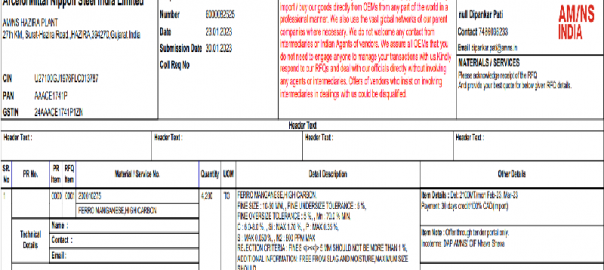 ArcelorMittal Nippon Steel India (AM/NS India) has floated a purchase tender for 4,200 t of high-carbon (HC) ferro manganese (Mn: 70%, Size: 10-50mm) for its Gujarat-based plant. The last date for submission of bids is 30 Jan’23. The delivery is scheduled for Feb-Mar and the payment terms include credit of 30 days.