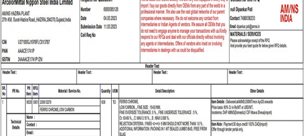 ArcelorMittal Nippon Steel India (AM/NS India) has floated a purchase tender for 600 t of low-carbon (LC) ferro chrome (Mn: 60-65%, size: 10-50mm) for its Gujarat-based plant. The last date for submission of bids is 11 Mar’23. The delivery is scheduled for Apr and the payment terms include a credit of 30 days.