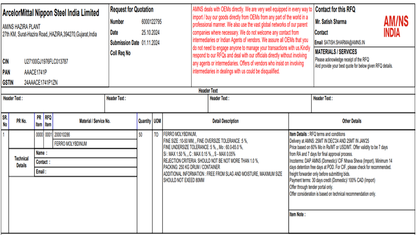 ArcelorMittal Nippon Steel (AM/NS) India has floated a purchase tender for 50 t of ferro molybdenum (Mo: 60-65%, 10-50 mm) for its Gujarat-based plant. The deadline for submission of bids is 1 Nov’24. According to BigMint’s assessment, ferro molybdenum (Mo: 60%, 10-100 mm) prices stood at INR 2,591,000/t exw-Nagpur on 25 Oct’24.