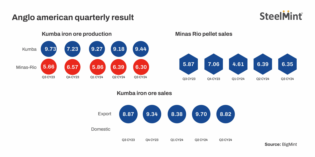 Minas-Rio’s pellet sales were recorded at 6.36 mnt (wet tonne basis) in Q3CY’24, registering a decline of 7% q-o-q as compared to 6.80 mnt in Q2CY’24.