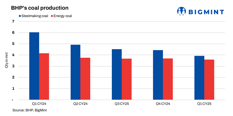 BHP’s coal production for the first three months of CY’25 totalled 7.5 million tonnes (mnt), showing a sharp 26% decline from 10.2 mnt in Q1CY’24. This y-o-y drop was driven by a significant 35% decrease in steelmaking coal production and a 13% fall in energy coal output.