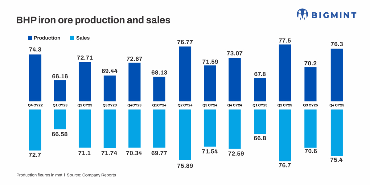 BHP has announced its Q4CY’25 (October-December 2025) results, revealing that iron ore production from all its Western Australia mines totalled 76.3 million tonnes (mnt) on a 100% basis, higher by 8.7% from 70.2 mnt in Q3CY’25. Meanwhile, iron ore sales also rose by 6.8% q-o-q to 75.4 mnt against 70.6 mnt in the past quarter.
