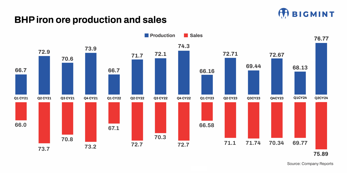On a quarterly basis, BHP’s output rose by 13% q-o-q to 76.77 mnt in Q2 CY’24 compared to 68.13 mnt in Q1CY’24.