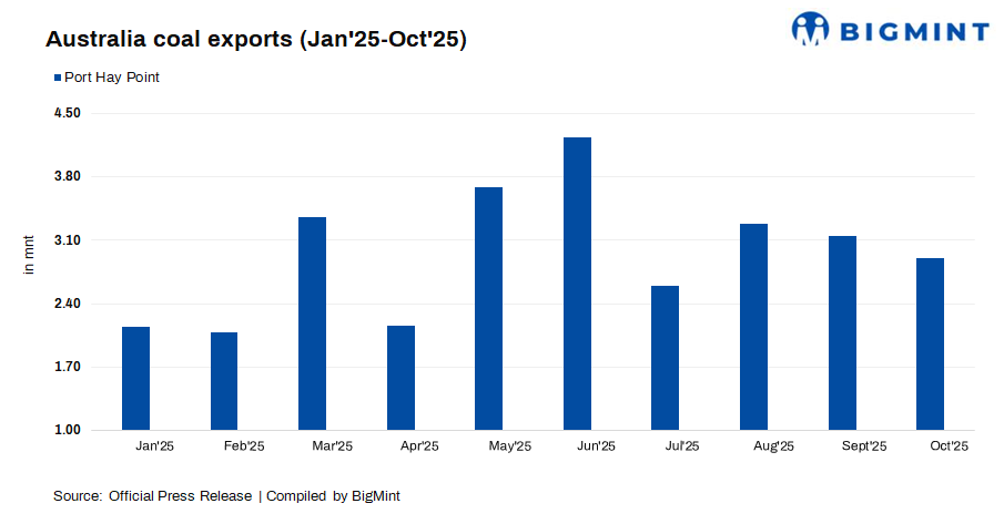 - Australia’s Port Hay Point recorded coal shipments of 2.90 mnt in Oct’25, down by 7.9% from 3.15 mnt in Sep’25, as per an official press release.