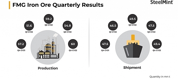 Australia’s leading miner, Fortescue Metals Group (FMG), has released its operational results for the December quarter. Iron ore shipments in the Calendar year 2022 (CY22) were recorded at 192.9 million tonnes (mnt), up by 4.4% y-o-y compared to 184.7 mnt in CY21. Iron ore export to China increased in CY22 due to low grade iron ore demand in the Chinese market. As a result, FMG’s shipments also increased.