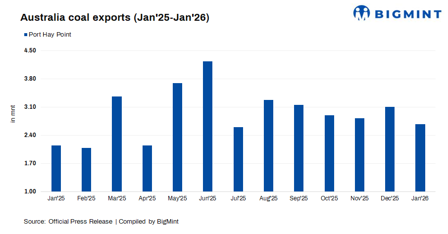 - Australia’s Port Hay Point recorded coal shipments of 2.68 mnt in Jan’26, down 14% m-o-m from 3.11 mnt in Dec’25. The decline was mainly due to seasonal weather disruptions and lower loading activity.