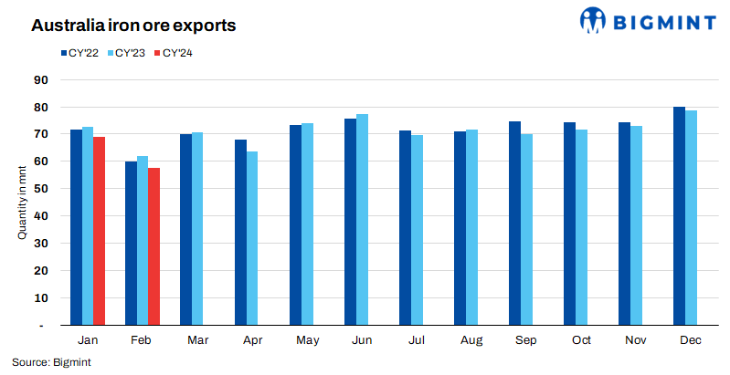 Australia’s iron ore and pellet export shipments fell by 17% m-o-m to 57.5 million tonnes (mnt) in February 2024 compared to 69.1 mnt in January, as per vessel line-up data maintained with BigMint. Meanwhile, shipments dipped by 7% y-o-y to 57.5 mnt in February, 2024 compared to 62 mnt in February, 2023.