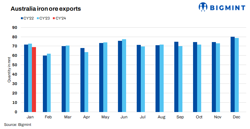 Australia’s iron ore and pellet export shipments fell by 12% m-o-m to 69.1 million tonnes (mnt) in January 2024 compared to 78.7 mnt in December, as per vessel line-up data maintained with BigMint. Meanwhile, shipments dipped by 5% y-o-y to 69.1 mnt in January, 2024 compared to 72.6 mnt in January, 2023.
