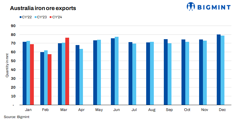 Australia’s iron ore and pellet export shipments climbed by 33% m-o-m to 76.3 million tonnes (mnt) in March 2024 compared to 57.5 mnt in February, as per vessel line-up data maintained with BigMint. However, owing to heavy rain in the February, 2024 which impacted the iron ore shipment from Australia though in March all major suppliers push to maximise volumes towards the cyclone season end. Meanwhile, shipments rose by 8% y-o-y to 76.3 mnt in March, 2024 compared to 70.8 mnt in March, 2023.