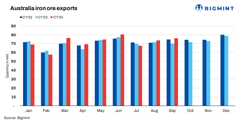 Australia’s iron ore exports to the world’s largest importer, China, were recorded at 541 mnt in 9MCY24, an increase of 2% y-o-y against 529 mnt in 9MCY’23. Meanwhile, exports rose by 4% m-o-m to 65 mnt in September as against 62.4 mnt in August.