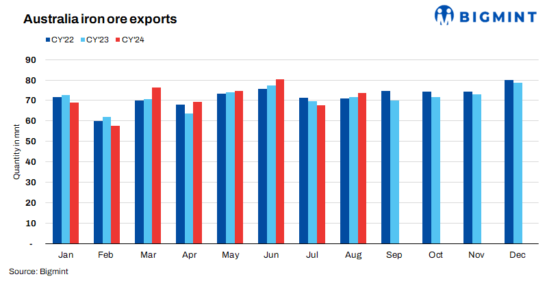 Australia’s iron ore and pellet export shipments rose by 8% m-o-m to 73.5 million tonnes (mnt) in August 2024 compared to 67.8 mnt in July, as per vessel line-up data maintained with BigMint. Meanwhile, shipments inched up by 2% y-o-y in August 2024 compared to 71.8 mnt in August 2023.