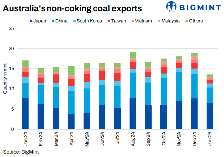 Australia’s non-coking coal exports dropped significantly by 25% in January 2025, to 14.28 million tonnes (mnt), compared to 18.97 mnt in December 2024. This represents a 16% y-o-y decrease from the 17.05 mnt exported in January 2024. The sharp decline highlights reduced demand from key Asian markets, particularly Southeast Asia.