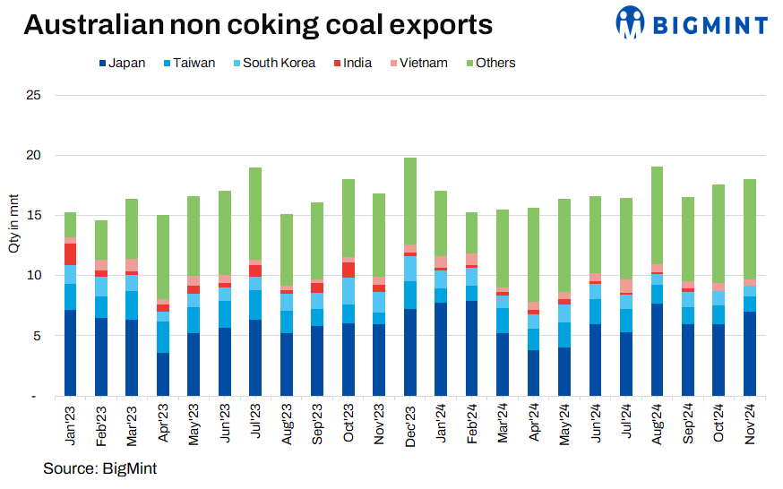 Australia’s non-coking coal exports to key Asian markets showed mixed demand trends in November 2024. Shipments to China rose 10% m-o-m to 7.29 mnt, while exports to Japan increased by 16% m-o-m to 7 mnt. However, Taiwan experienced a 21% m-o-m decline in imports to 1.23 mnt, and South Korea saw a significant 22% m-o-m drop to 0.93 mnt.