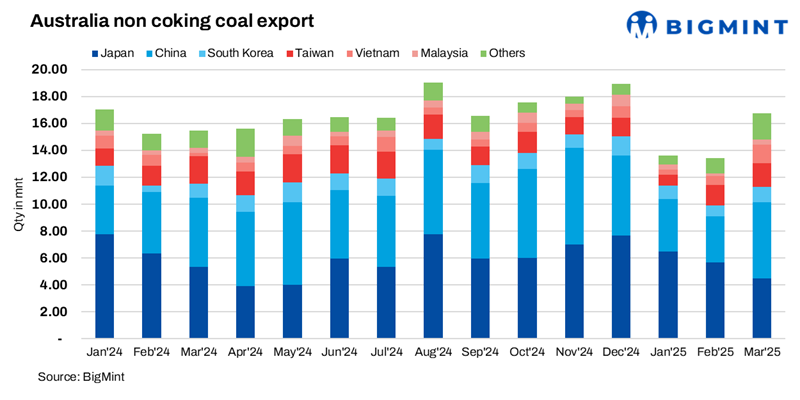 Australia’s non-coking coal exports rose 24.7% to 16.77 million tonnes (mnt) in March 2025, compared to 13.45 mnt in February. Additionally, exports grew 8.3% y-o-y from 15.48 mnt in March 2024. The rise follows increased demand from key Asian markets, particularly Southeast Asia.