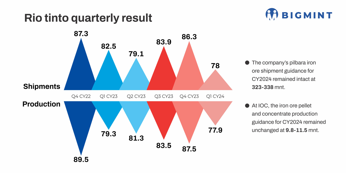 The world’s leading iron ore miner, Rio Tinto, recorded iron ore shipments at 78 million tonnes (mnt) for Q1CY’24, down by 5% y-o-y as compared to 82.5 mnt in Q1CY’23. Shipments, on a quarterly basis, decreased against 86.3 mnt in Q4CY’23. Shipments fell amid weather disruptions at ports and reduced production from some of Rio’s Western Australian mines. SP10 volumes accounted for 18% of shipments in the first quarter, in line with the second half of 2023.