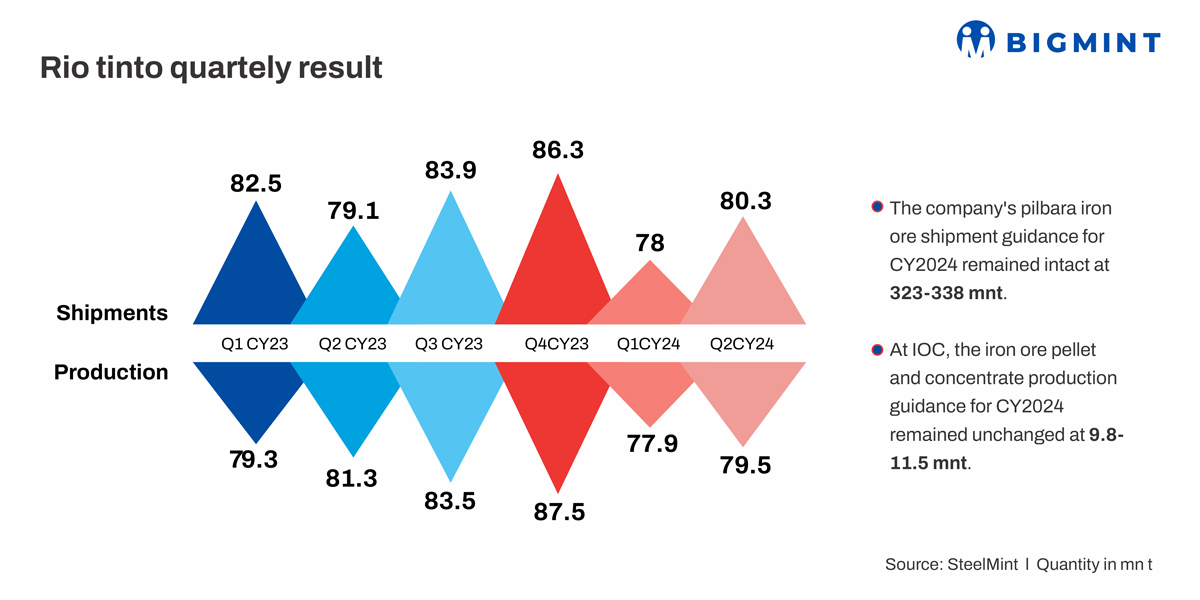 The total iron ore production marked a 2% drop to 157.4 mnt in H1CY’24 as against 160.6 mnt in H1CY’23. The impact of ore depletion was mitigated by increased productivity. However, production and shipping were hampered by a train collision in mid-May, resulting in lost rail capacity for approximately six days and maxed-out mine stockpiles.