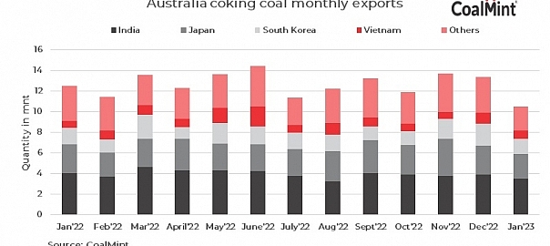 Australian coking coal exports stood at 10.48 million tonnes (mnt) in January 2023, a decrease of 21% m-o-m and 16% y-o-y. The drop in exports was due to heavy rains and floods in Australia, which caused disruptions in supplies. Notably, this is the second consecutive monthly decline in coking coal exports from Australia.