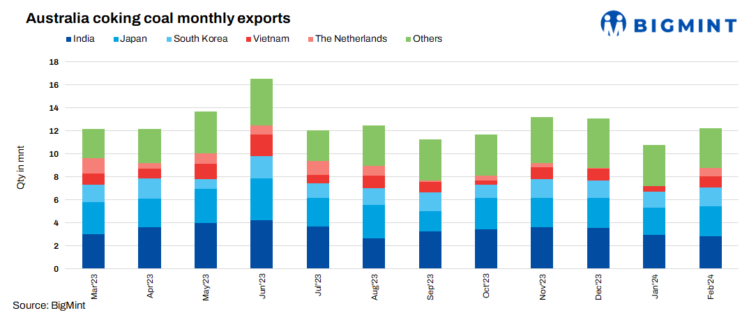 India, formerly the largest buyer of Australian coking coal, experienced an 11% m-o-m rise in imports at 3.28 mnt in February 2024, compared to 2.95 mnt in January 2024. driven by its attractive prices and smoother supply situation. Shipments to Japan increased by 10% m-o-m to 2.65 mnt in February as against 2.45 mnt in January. Exports to South Korea dropped 33% at 0.94 mnt in February. Imports by Indonesia (up by 35%) and China (down 12%) were recorded at 0.63 mnt and 0.74 mnt, respectively.