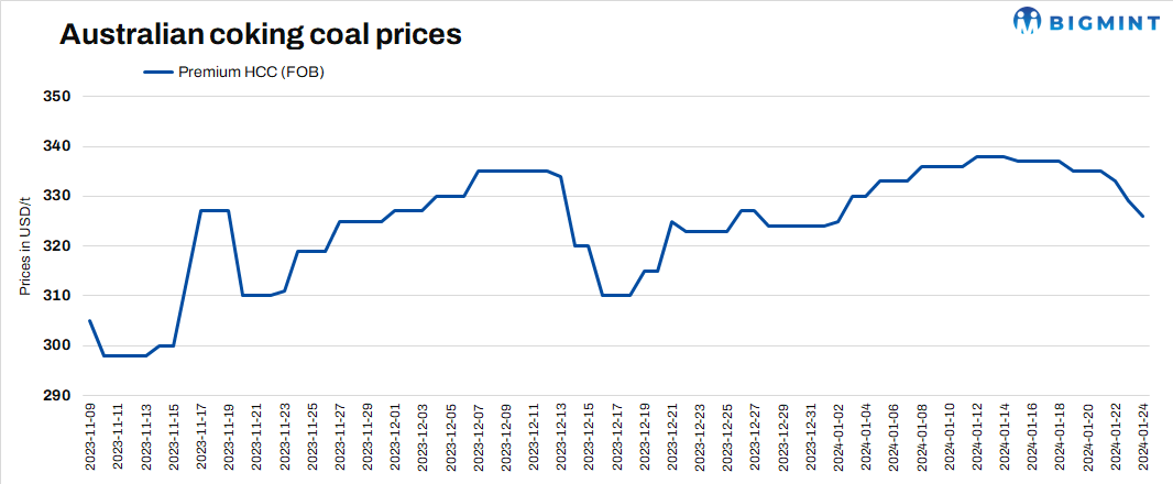 Australian coking coal prices fell by $3/t d-o-d to $326/t on 24 Jan’24 amid trade concluded at a lower level. A deal by an International Steel maker was heard concluded at $326/t FOB for about 40,000t GYC for 18-27 Feb’24 laycan. Market participants anticipate a price rebound due to the latest adverse weather conditions and the impending impact of the cyclone.