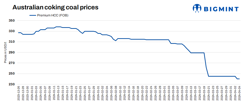 Australian coking coal prices fell by $7/tonne (t) d-o-d to $240/t on 2 April, 2024. The subdued demand for coking coal has led to an oversupply of cargoes in the market. Buyers are seeking price cuts for future contracts to mitigate costs, thereby driving spot prices down. Decreased demand from the steel sector is also contributing to the price decline.