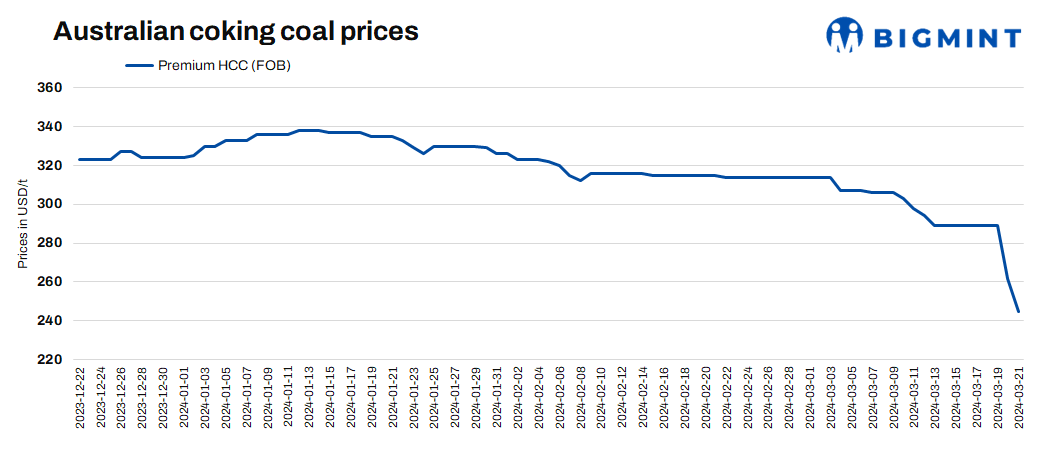 Australian coking coal prices fell by $7/t d-o-d to $245/t on 21 Mar’24. The muted demand for metallurgical coal has led to an overhang of cargoes in the market. Buyers are seeking price cuts for future contracts to reduce costs, further exerting downward pressure on spot prices. Market volatility and cautious sentiment among buyers are impacting pricing dynamics. Additionally, international market trends, such as lower raw material costs and declining end-user demand, are also influencing the drop in prices.