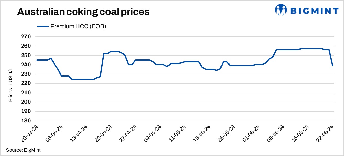 Australian coking coal prices fell by $16/t to $239/t FOB on 22 Jun’24 due to sufficient supplies in Jul, unsold Jun cargoes, and low tradable prices. A deal for a 40,000 t for July-loading of Moranbah North brand PHCC was concluded at $239/t FOB Australia. This price drop will aid countries facing margin declines in restocking their coking coal supplies.