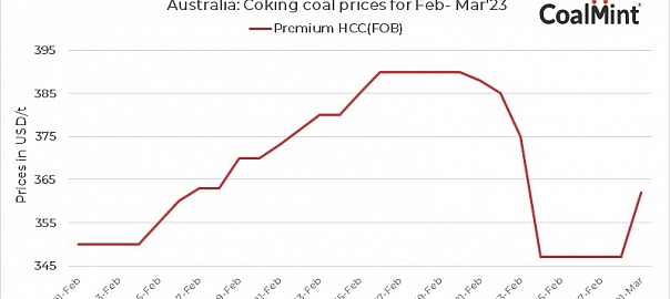 Australian premium hard coking coal prices fell by $10/t d-o-d to $375/t FOB on 23 Feb. An improvement in supply has resulted into fall in prices as logistical bottlenecks have eased. Moreover, buyers have been sidelined as prices fell for the third successive day.