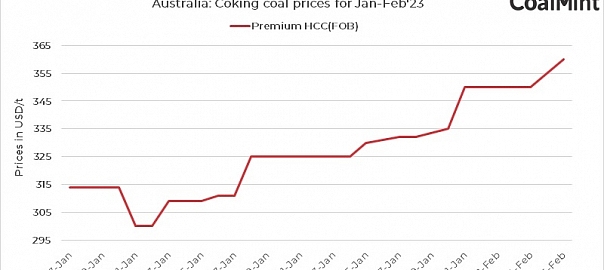 Australian premium hard coking coal prices increased by $10/t d-o-d to $360/t FOB on 6 Feb’23. Prices increased amid possibility of supply disputation because of tropical cyclone in the latter part of the week. Notably, Australian ports are struggling with delays in shipment resulting into supply tightness.