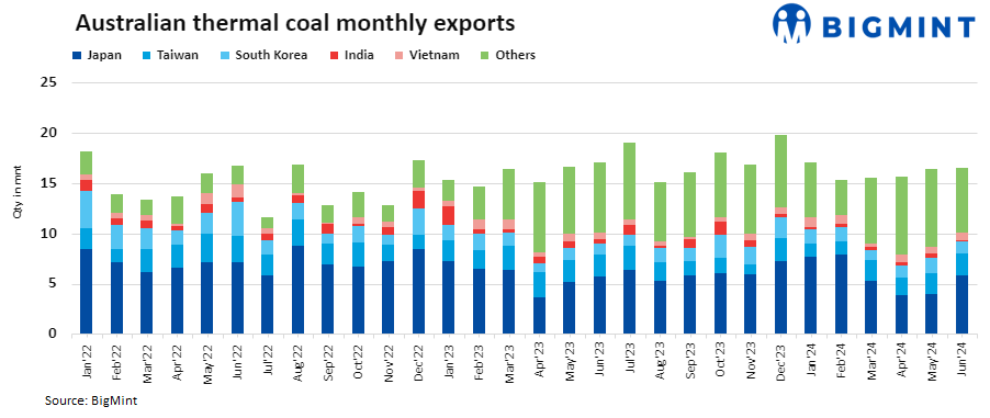 Australia’s non-coking coal shipments maintained a steady growth trajectory in H1CY’24, standing at 96.24 million tonnes (mnt) compared to 94.96 mnt in H1CY’23, marking a modest 1.35% y-o-y increase. Moreover, the momentum continued with a slight m-o-m increase in June, rising to 16.48 mnt from 16.36 mnt in May. This uptick reflects ongoing demand and operational efficiency in the sector, reinforcing Australia’s position as a key player in the international coal market. Also, approaching of the fiscal year-end added to the volume pick-up.