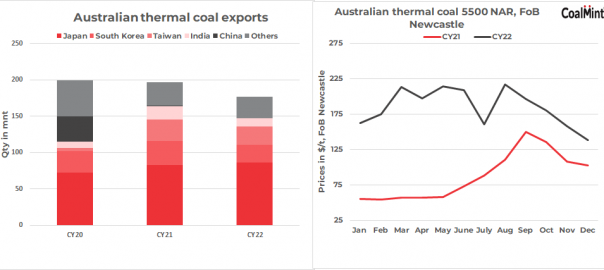 The Russia-Ukraine war and subsequent sanctions on Russian coal compelled EU buyers to import high-CV coal from alternate sources like Australia. This resulted in increased demand for Australian cargoes as well as elevated prices, forcing Asian countries to opt for relatively cheaper Indonesian coal.