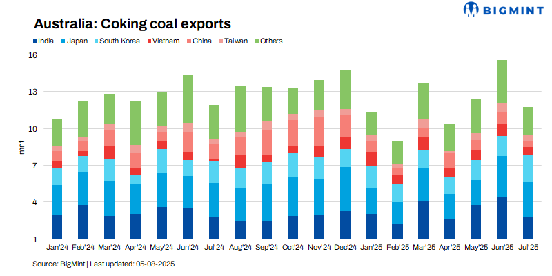 Australia’s coking coal exports are likely to stabilise in the near term, supported by restocking demand from India and Japan and a recovery in Chinese steel output. The late-July price rebound indicates renewed buyer interest following earlier procurement delays. However, the outlook remains cautiously optimistic amid global economic uncertainties, freight volatility, and evolving regulations, prompting exporters to adopt a prudent, demand-driven approach.