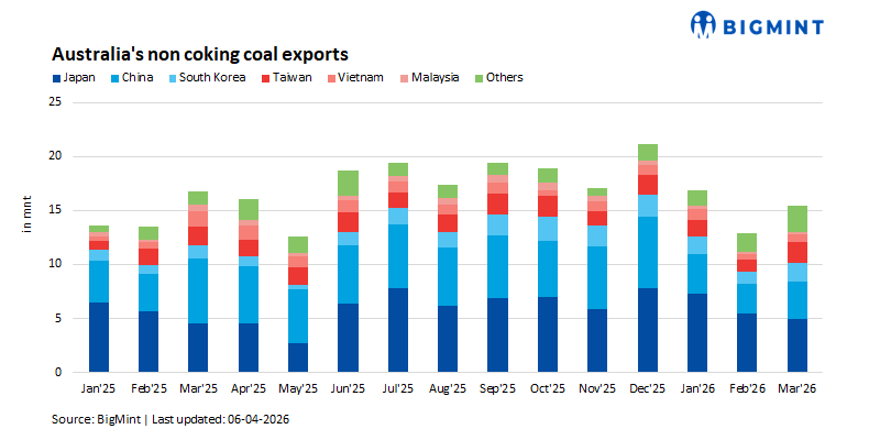Australia’s non-coking coal exports jump 20% m-o-m in Mar’26 amid mixed Asian demand