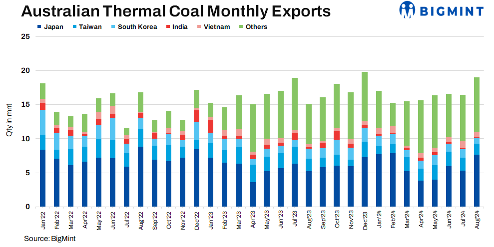 Australian thermal coal exports to Japan saw a remarkable 43.46% m-o-m growth in August 2024, rising to 7.66 mnt from 5.34 mnt in July 2024. Exports to China climbed by 10.82% m-o-m to 5.86 mnt in August 2024 from 5.29 mnt the previous month.