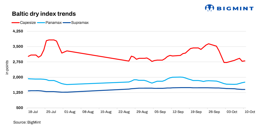 The Baltic Exchange’s dry bulk index rose 13 points d-o-d on 10 Oct’25 to 1,936 points. Stronger demand and tighter tonnage for Capesize and Panamax pushed the overall index up despite Supramax weakness.