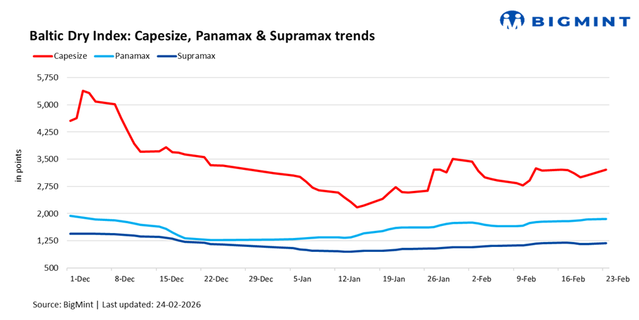 The Baltic Dry Index continue to rise by 3.37% (69 points) to 2,112 on 23 Feb’26 against 20 Feb, supported by stronger gains in the Capesize segment along with modest improvements in Panamax and Supramax earnings.
