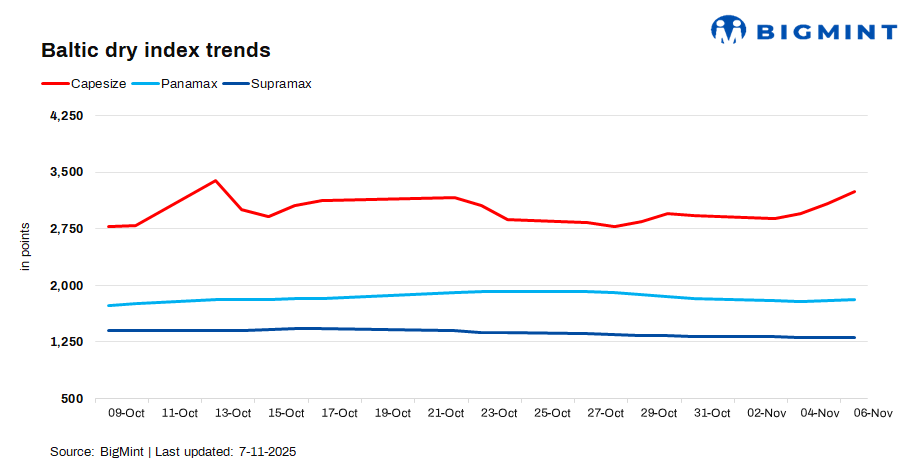 The Baltic Exchange’s dry bulk index surged 60 points d-o-d to 2,063 on 6 Nov’25. The index strengthened as Capesize rates surged on robust iron ore demand from major exporters and limited vessel availability on key routes, while Panamax and Supramax segments recorded moderate increases.