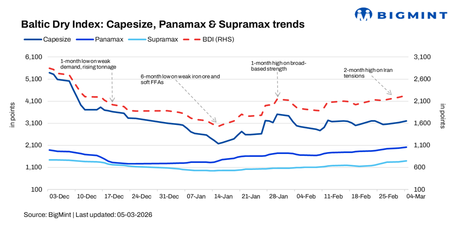 The Baltic Dry Index surged 2.15% (46 points) to 2,233 on 4 Mar’26 vs 2 Mar, supported by tight vessel supply and firm iron ore and coal demand. Middle East tensions added a bunker and routing-led risk premium.